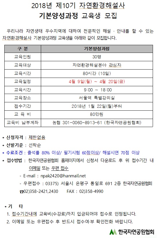 2018년 제10기 자연환경해설사 「기본양성과정」모집안내