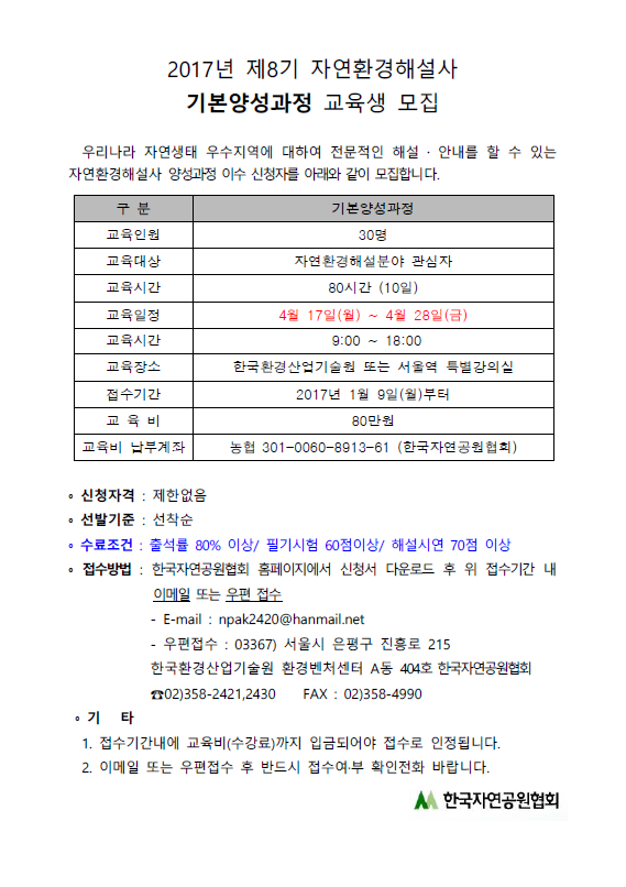 2017년 제8기 자연환경해설사 「기본양성과정」모집안내