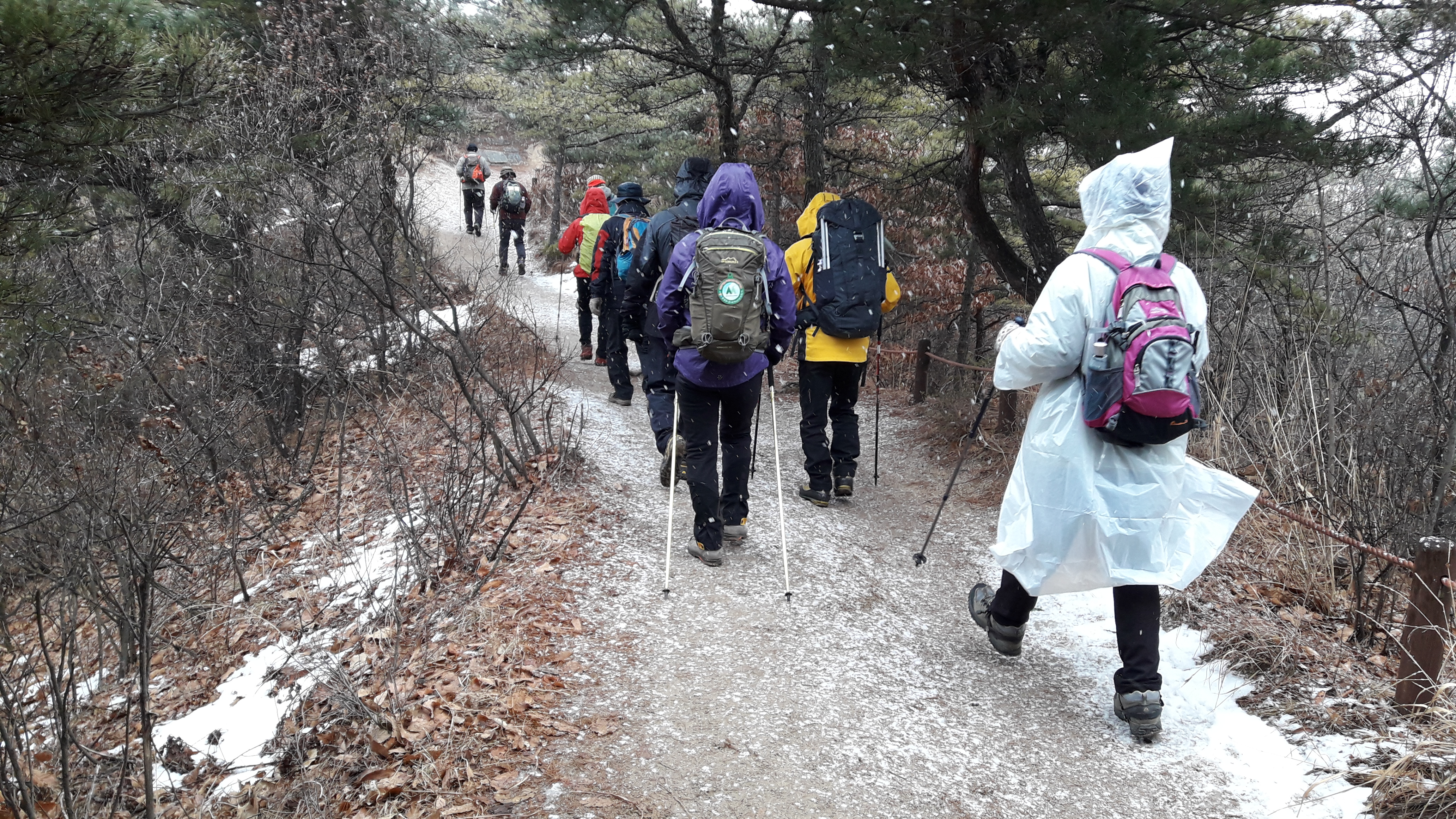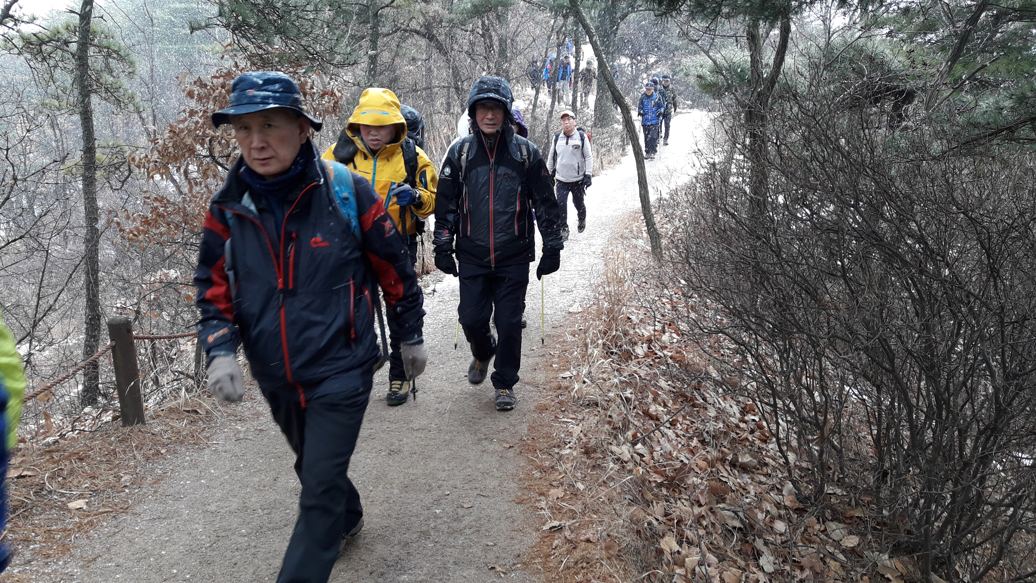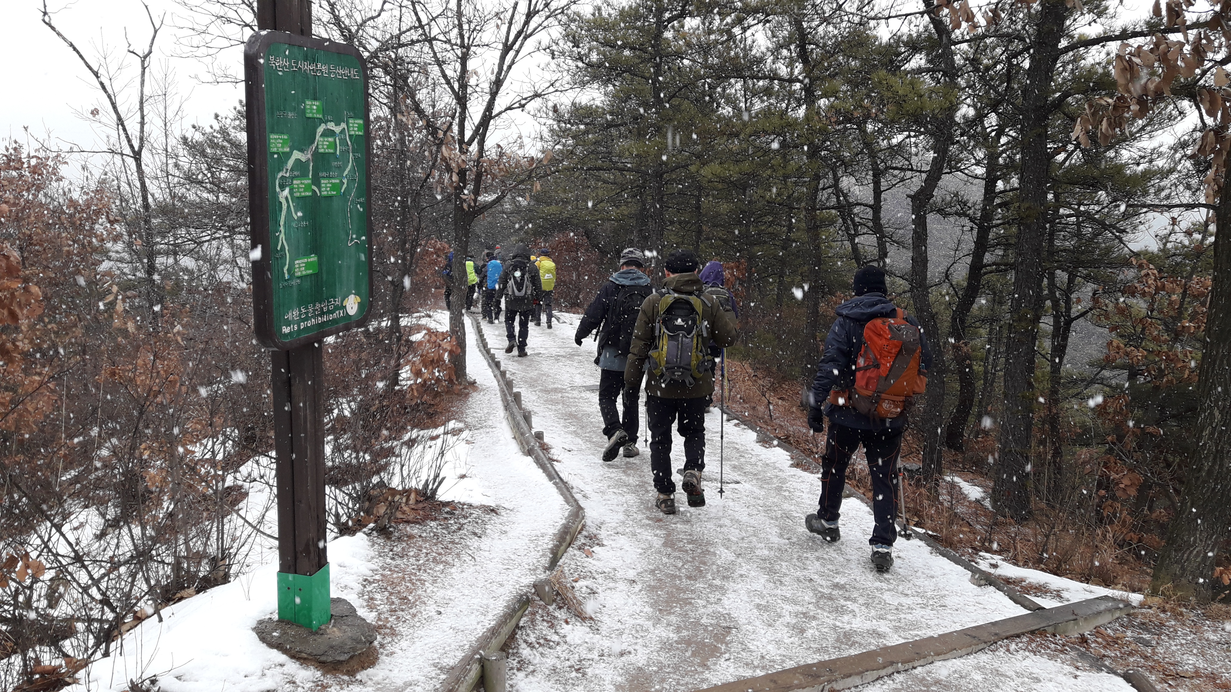 우리협회는 2월 5일(일) 10시부터 조규배회장 등 10여명이 참석한 가운데 2017년 2월 정기 북한산둘레길 행사를 가졌다. 이날 눈이 내리는 날씨에 진행된 코스는 지하철 3호선 녹번역 2번출구 - 서울시우수조망명소 - 탕춘대능선 - 각황사계곡 - 북한산생태공원으로 이어졌다.